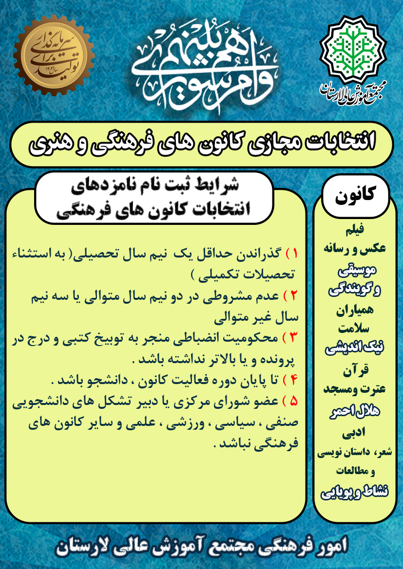 ثبت نام نامزدی در انتخابات کانون های فرهنگی مجتمع آموزش عالی لارستان سال تحصیلی 1404